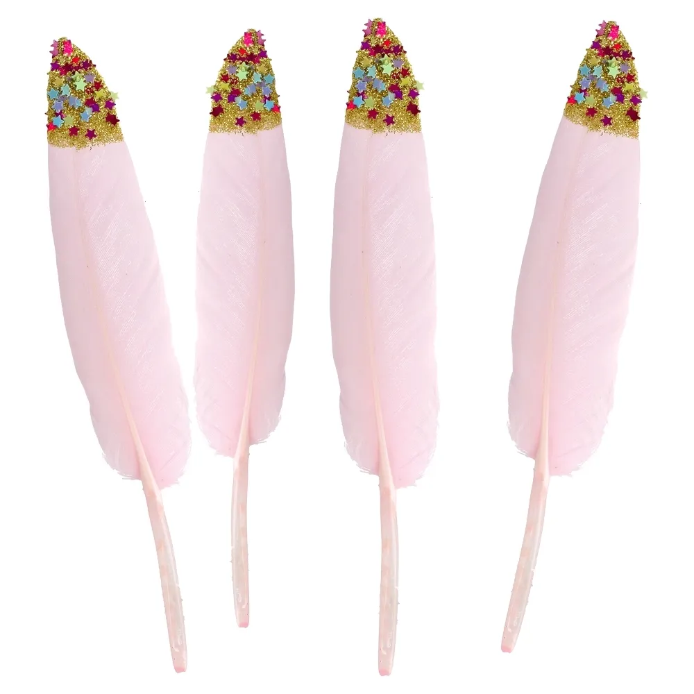 Crafty pom roze pero za dekoraciju, sa zlatnim glitter vrhom i šljokicama u obliku zvjezdica. Idealno za DIY projekte, scrapbooking i ukrašavanje poklona ili zabava. Lagano i jednostavno za lijepljenje i kombinovanje u kraft idejama.