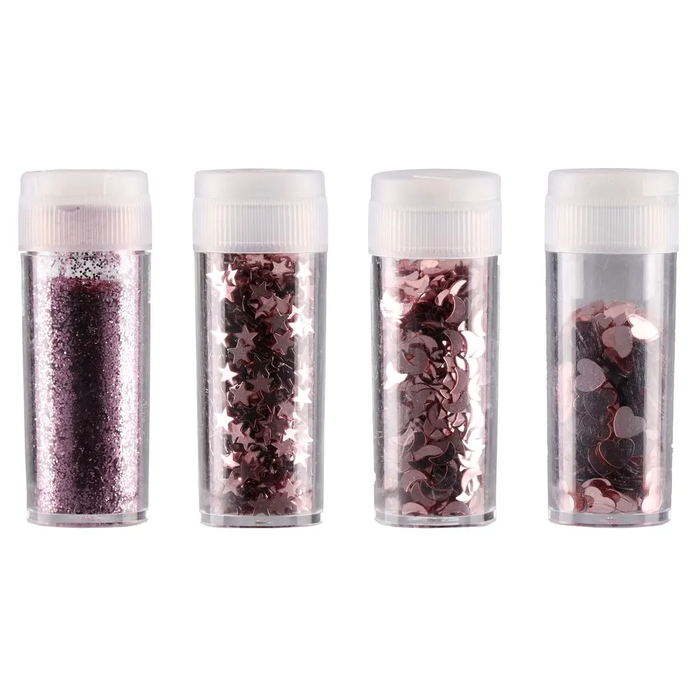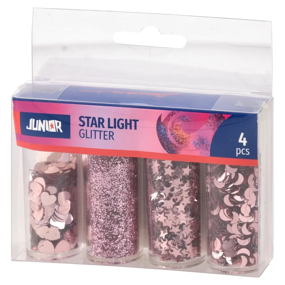 Star light šljokice, roze miks u 4 bočice: sitni glitter, zvjezdice, polumjeseci i srca. Idealno za dekoracije, DIY i scrapbooking. U praktičnim bočicama za lako doziranje, dodaju sjaj i naglašavaju detalje na projektima.