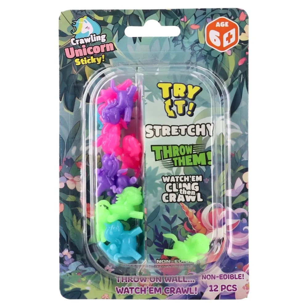 Squeezy unicorn je gumena, rastezljiva i ljepljiva igračka u obliku jednoroga. Bacite na zid i gledajte kako prianja i polako klizi. Set 12 kom, za uzrast 6+. Idealno za kratku igru i zabavu. Nije jestivo.