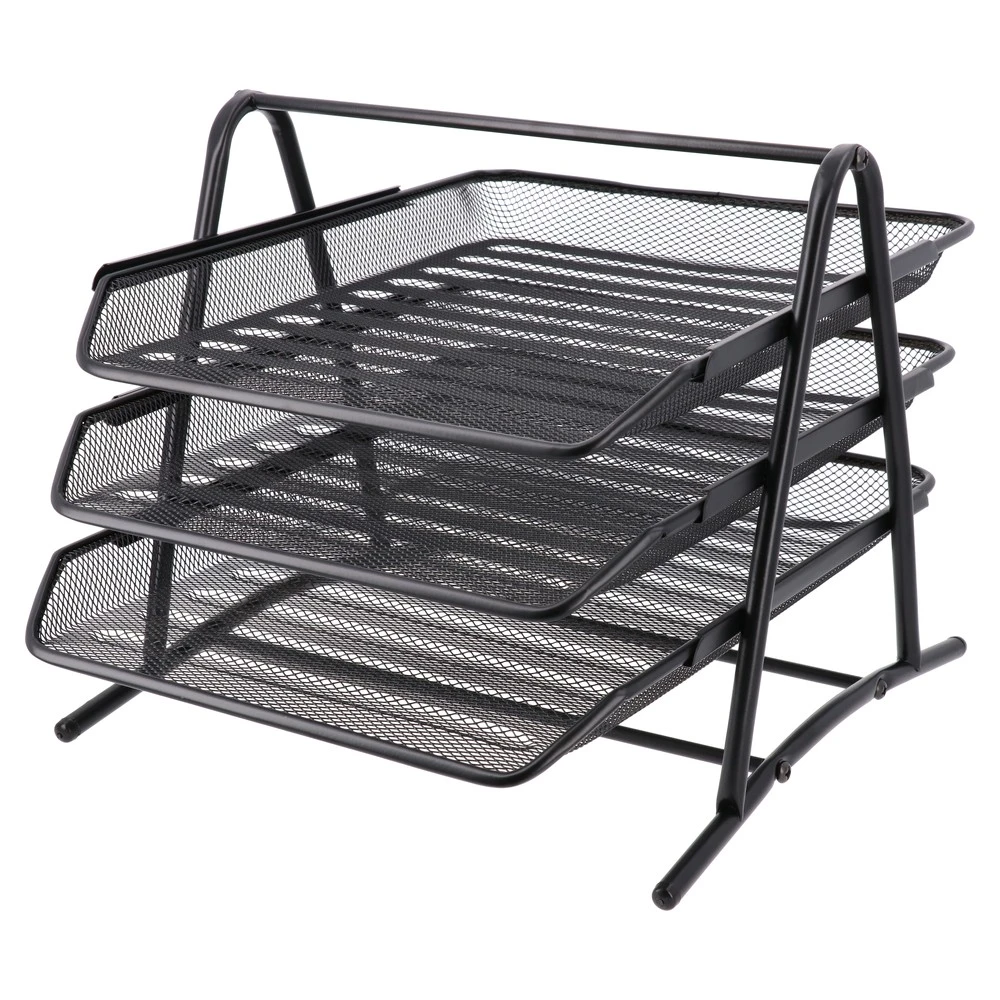 Žičana polica za dokumente, horizontalna, sa 3 nivoa. Izrađena od crnog metalnog mrežastog materijala za bolju preglednost i ventilaciju papira. Idealna za organizaciju dokumenata na stolu i brži pristup svakodnevnim papirima.
