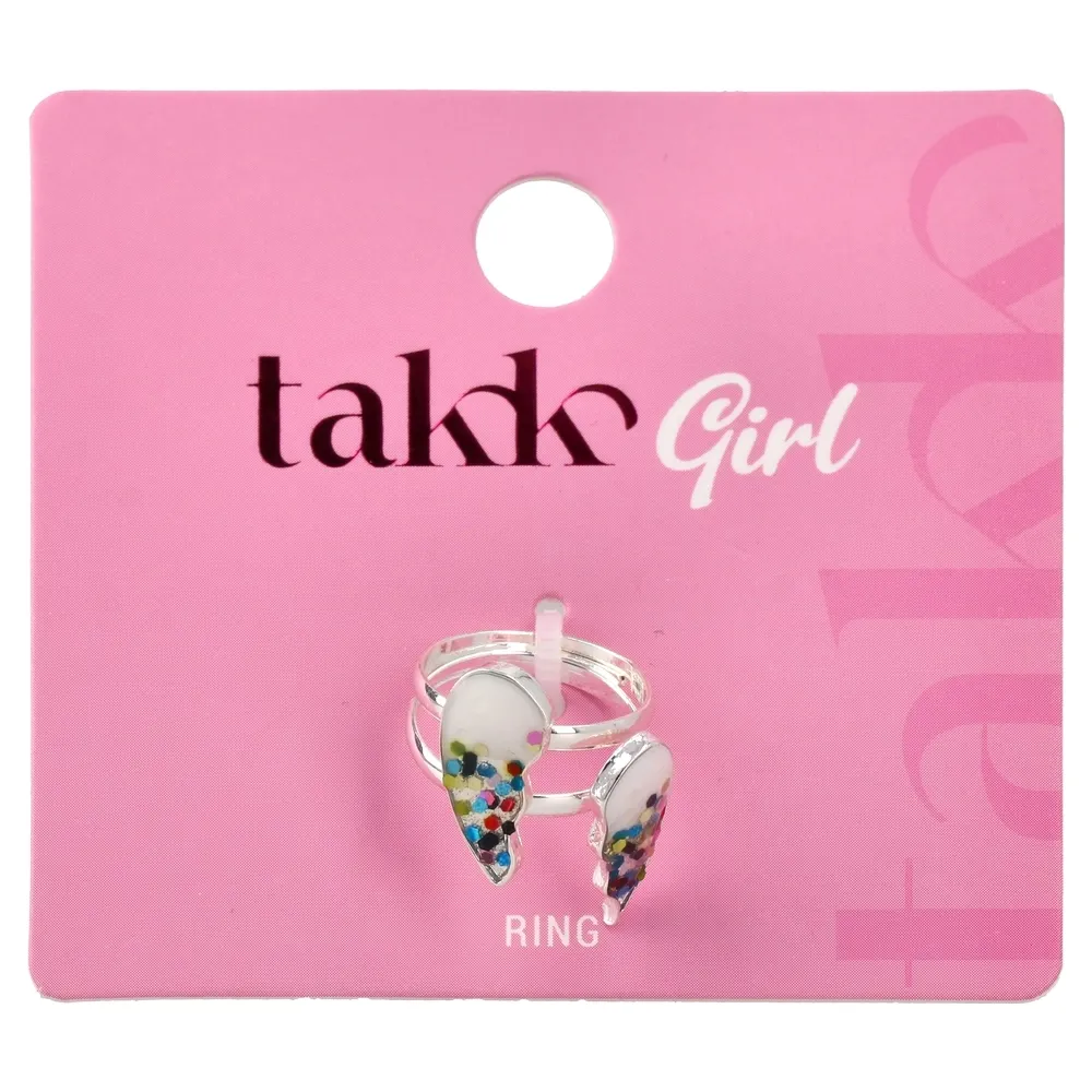 Prsten Dora girl sa motivom krila, od metala u srebrnom tonu, sa šarenim detaljima. Idealan modni dodatak za djevojčice; lako se uklapa u svakodnevne kombinacije i posebne prilike. Nježan akcenat za veseli stil.