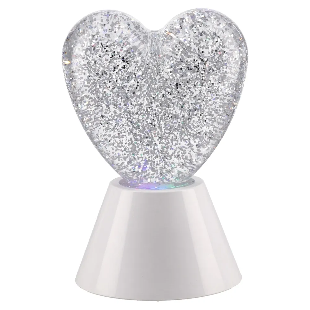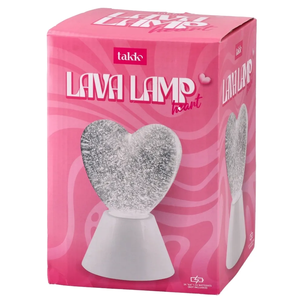 Lava lampa u obliku srca za ambijentalno osvjetljenje. Prozirno kućište sa srebrnim šljokicama na bijelom postolju stvara nježan sjaj i dekorativni efekt. Idealna kao stolna dekoracija i poklon za romantičan ugođaj.