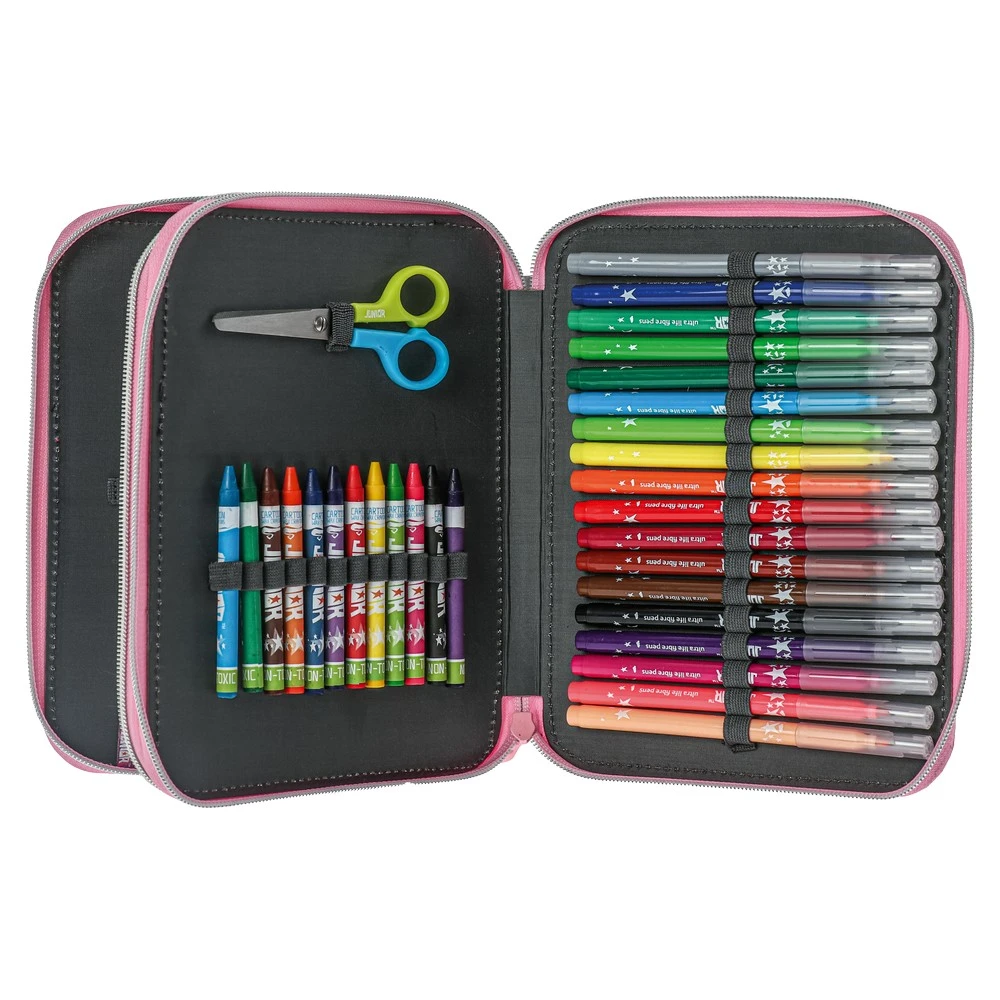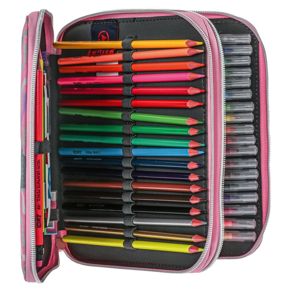Double Decker Grande je Play pernica koja se ističe originalnim dizajnom i izrađena je od visokokvalitetnog materijala. Sadrži sve što jednom učeniku treba.Punjena je Junior školskim priborom i sadrži: 18 Junior drvenih bojica, 18 Junior flomastera, 12 voštanih boja, 1HB grafitnu olovku, 1tehničku olovku, 2 hemijske olovke, rezač, gumicu za brisanje, makaze i lenjir.